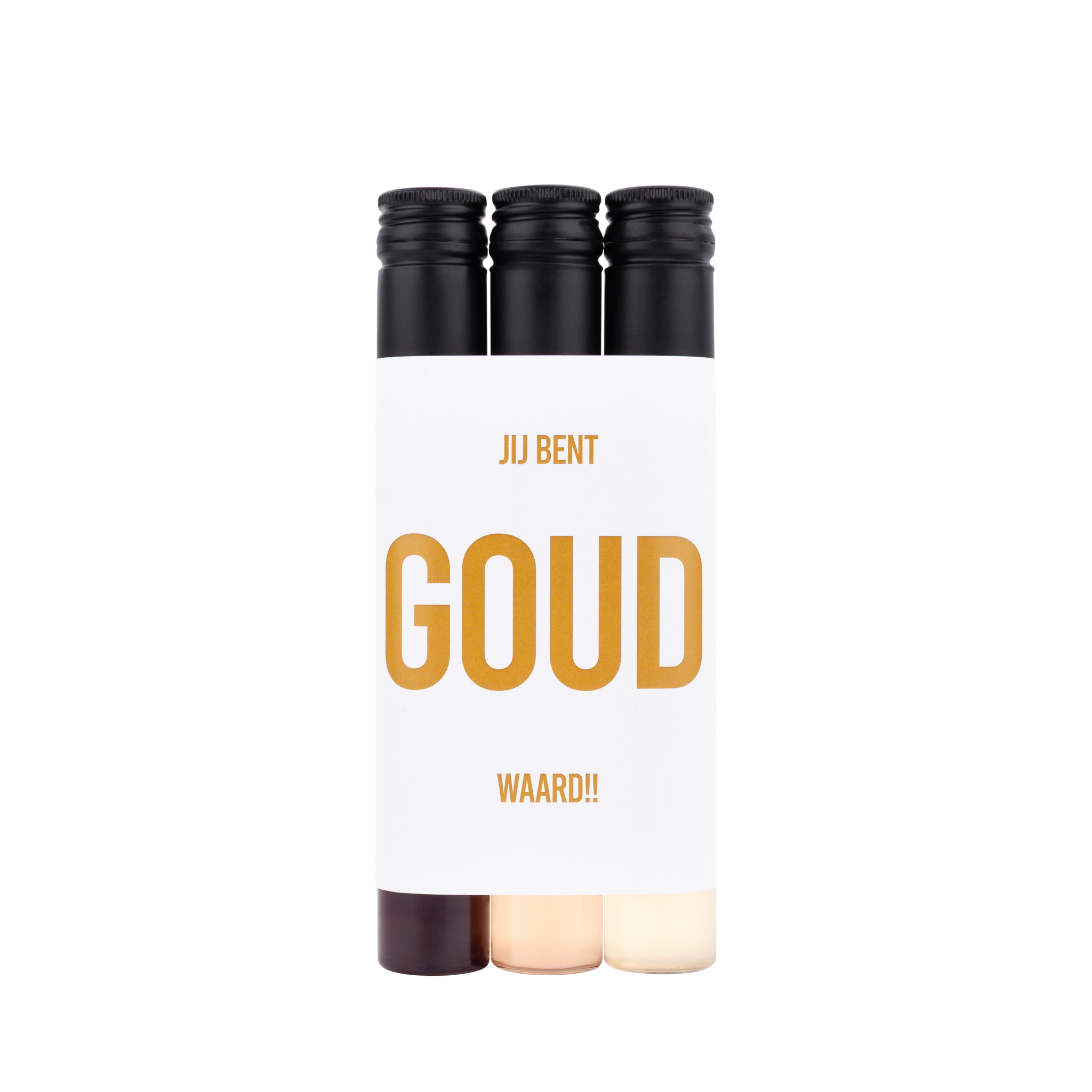 Een heerlijk wijnproeverijtje met de tekst 'Jij bent GOUD waard!'. Het perfecte kado voor een echte wijnliefhebber. Rood, rosé en wit!