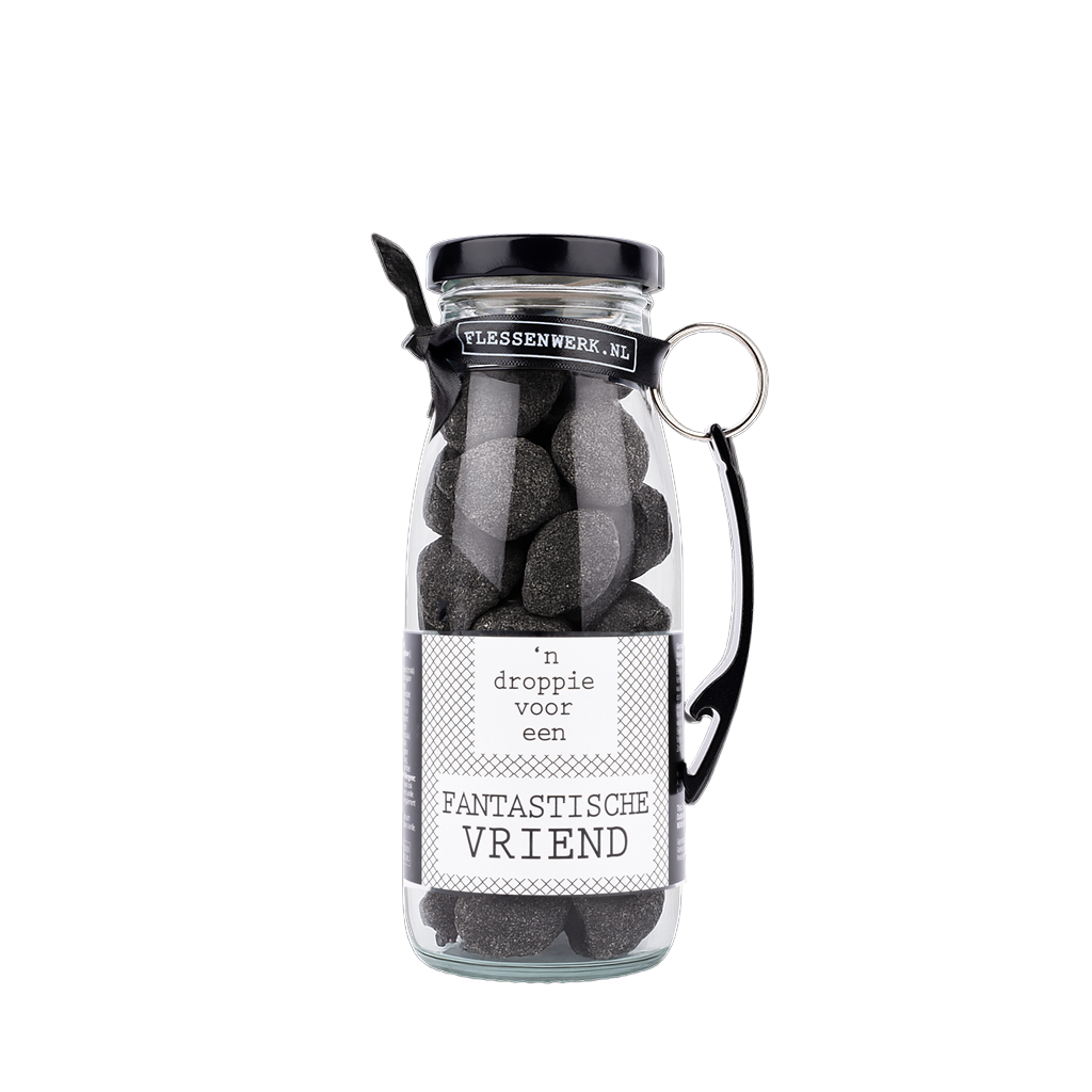 Leuk flesje gevuld met heerlijke drop. Op de fles staat de tekst 'n Droppie voor een fantastische vriend' en aan het flesje zit een handige flessenopener. Een lekker origineel en tegelijkertijd grappig kado om aan een vriend te geven.