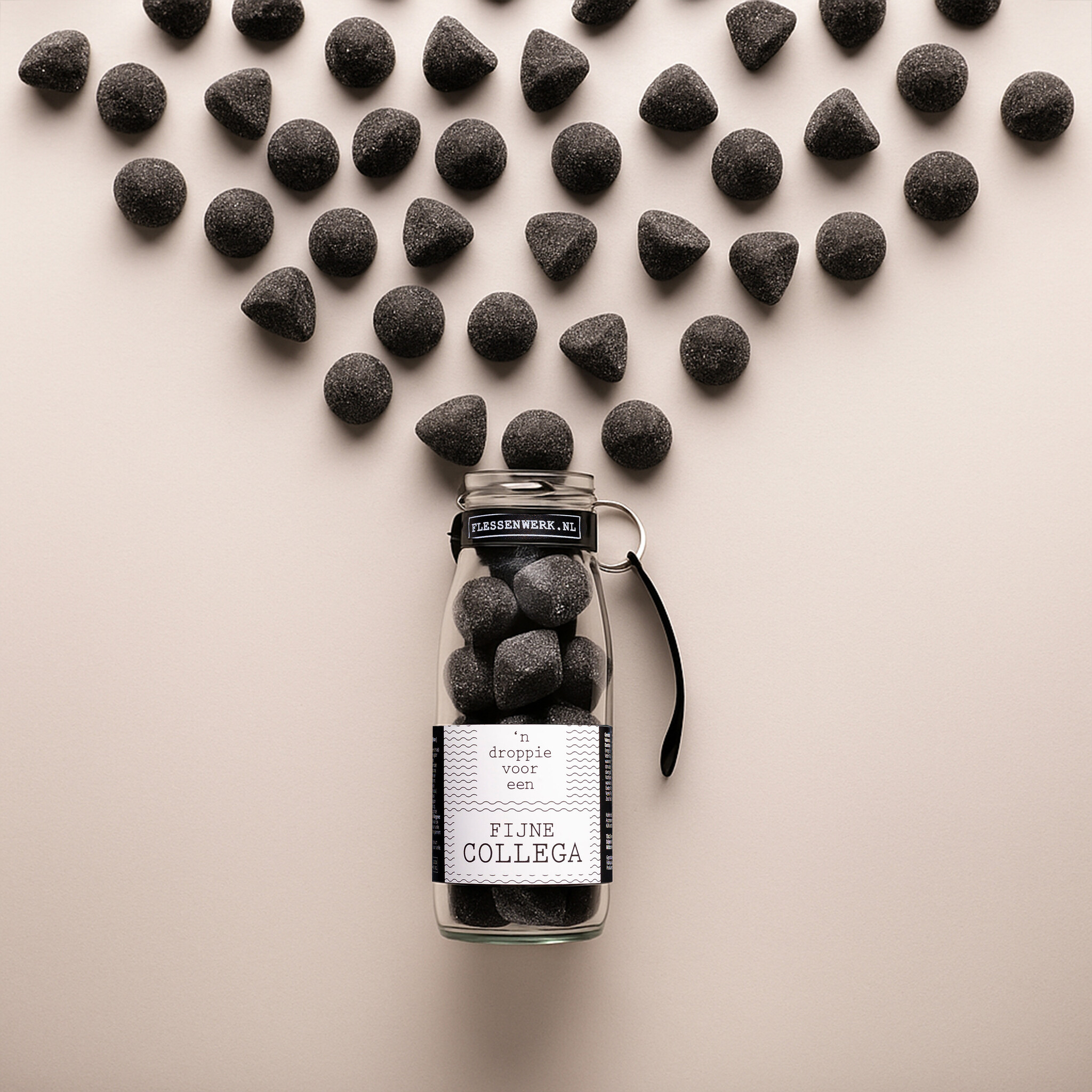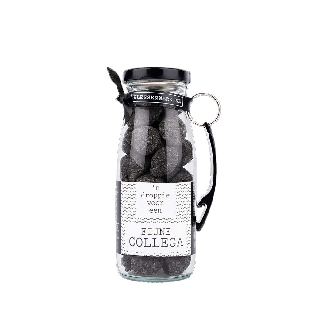 Leuk flesje gevuld met heerlijke drop. Op de fles staat de tekst 'n Droppie voor een fijne collega' en aan het flesje zit een handige flessenopener. Een lekker origineel en tegelijkertijd grappig kado om aan een collega te geven.
