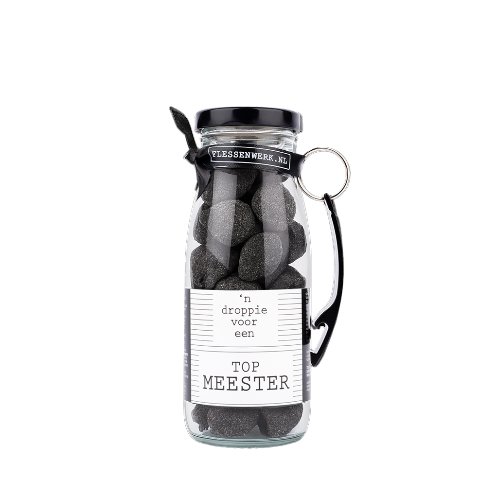 Leuk flesje gevuld met heerlijke drop. Op de fles staat de tekst 'n Droppie voor een topmeester' en aan het flesje zit een handige flessenopener. Een lekker origineel en tegelijkertijd grappig kado om aan de meester te geven.