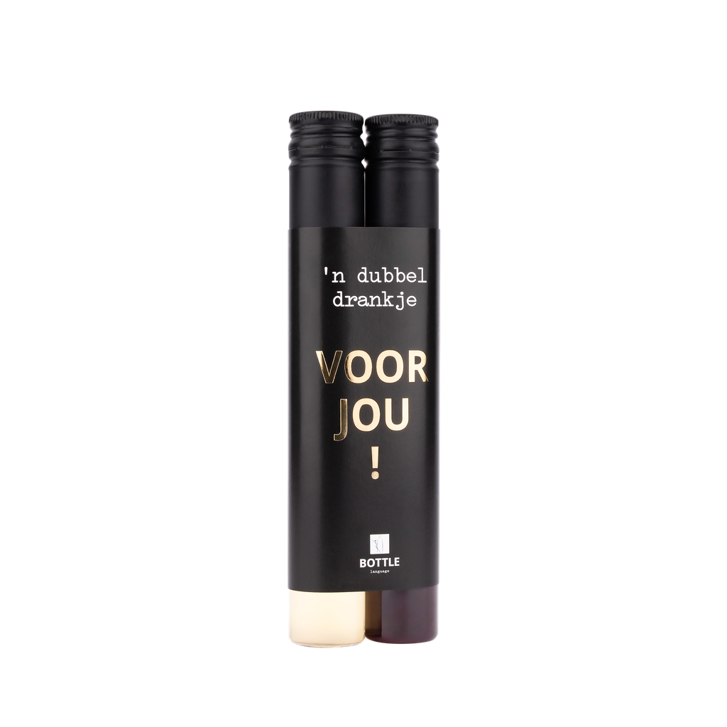 Een rode en een witte wijn in één pakketje. Op het zwarte etiket met goudfolie staat de tekst 'Dubbel drankje voor jou!'. Dit heerlijke dubbel drankje past door de brievenbus.