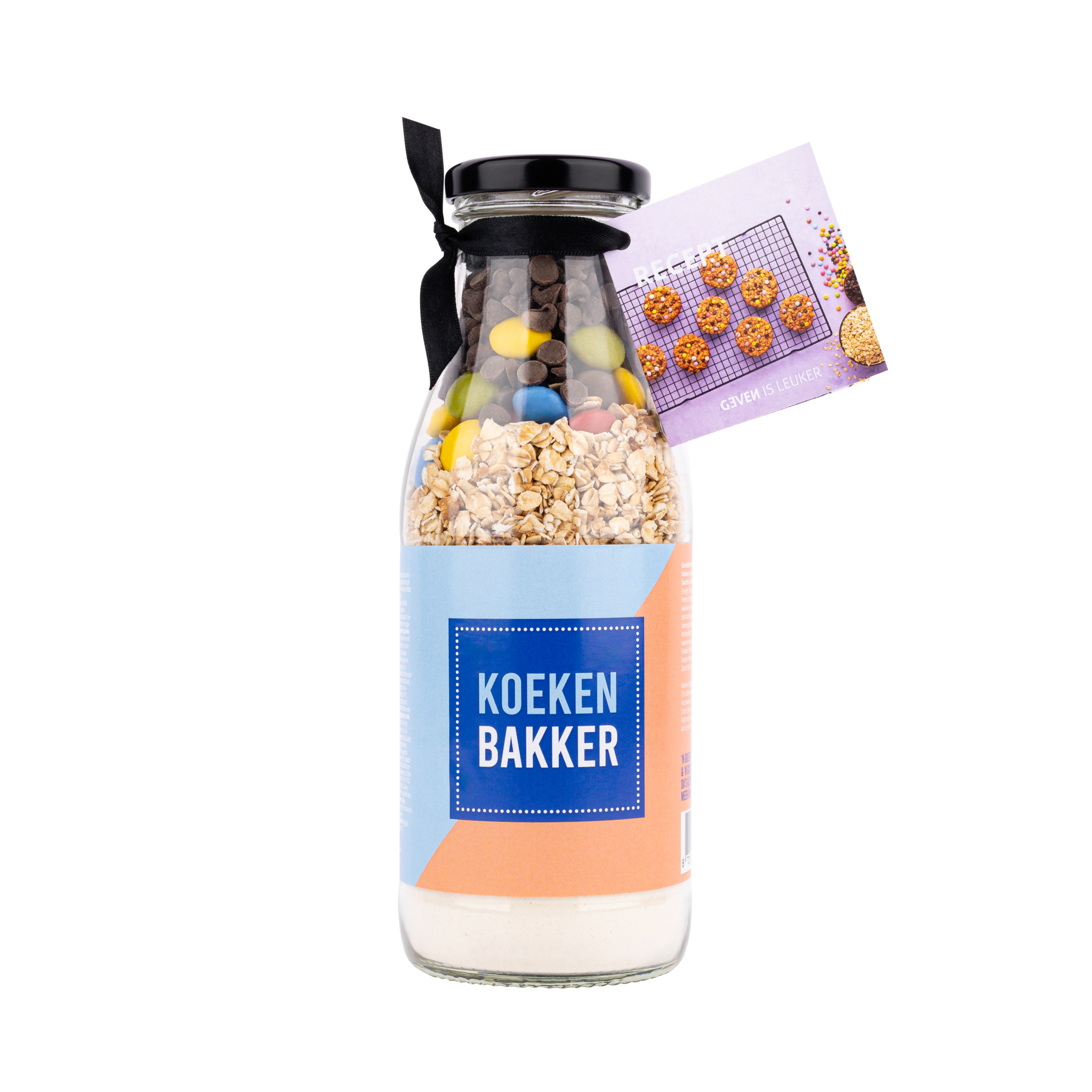 In dit leuke flesje met kaartje en de tekst 'Koekenbakker!' zit een heerlijk kant-en-klaar bakrecept voor chocoladekoekjes.