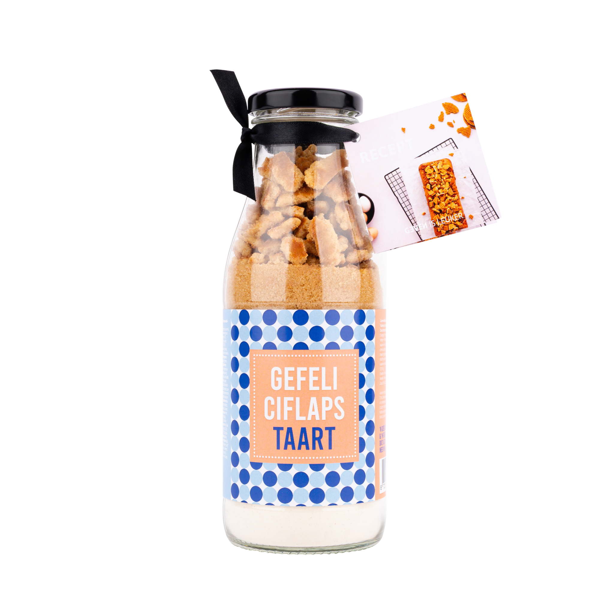 Kadootjes die eruit zien om op te eten – letterlijk! In dit leuke flesje met kaartje en de tekst 'Gefeliciflaps-TAART!' zit een heerlijk kant-en-klaar bakrecept voor een stroopwafelcake. Leuk om te geven of zelf te bakken.