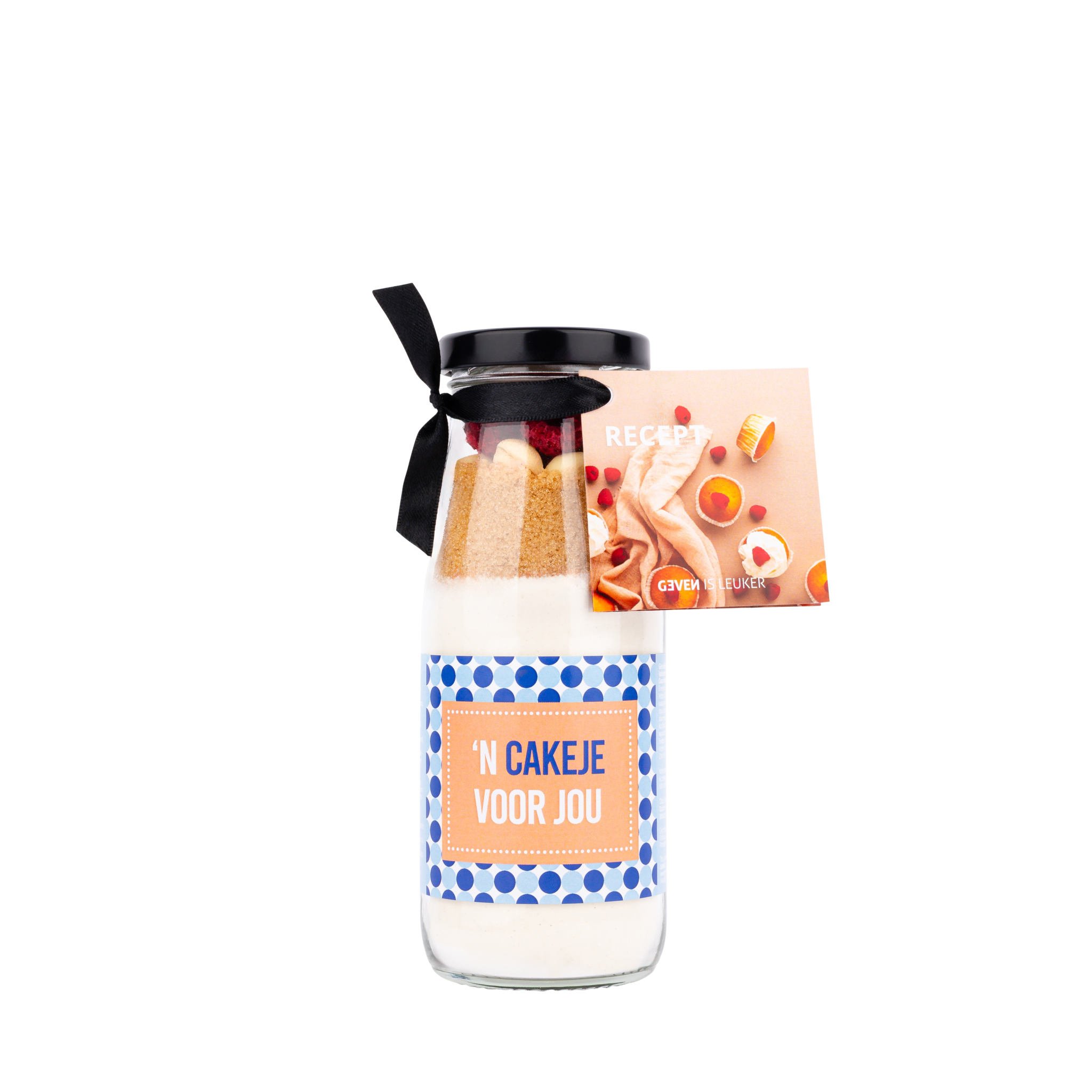 Kadootjes die eruit zien om op te eten – letterlijk! In dit leuke flesje met kaartje en tekst ' 'n cakeje voor jou!' zit een heerlijk kant-en-klaar bakrecept.