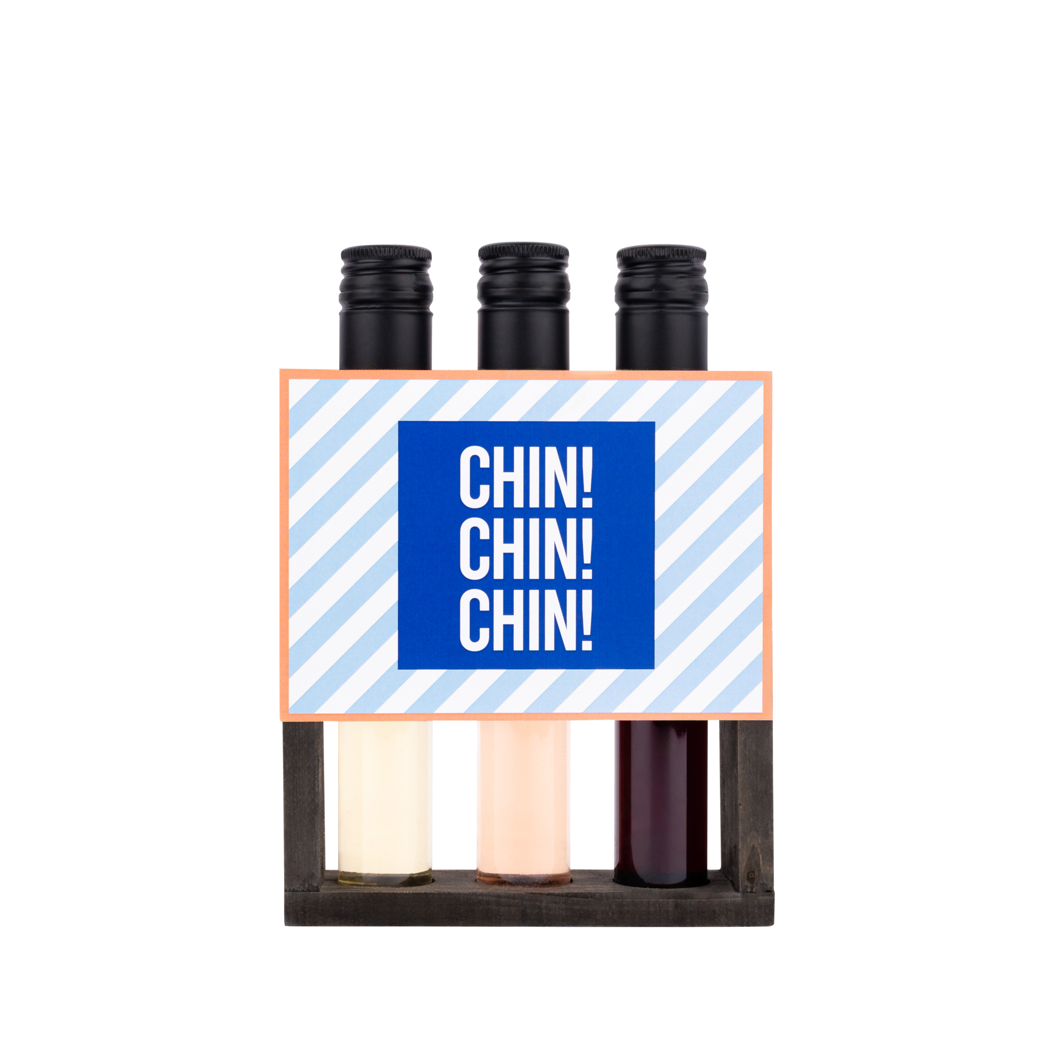 Een heerlijk wijnproeverijtje met de tekst Chin! Chin! Chin! Deze 3 tubes in houten rekje is het perfecte kado voor een echte wijnliefhebber.