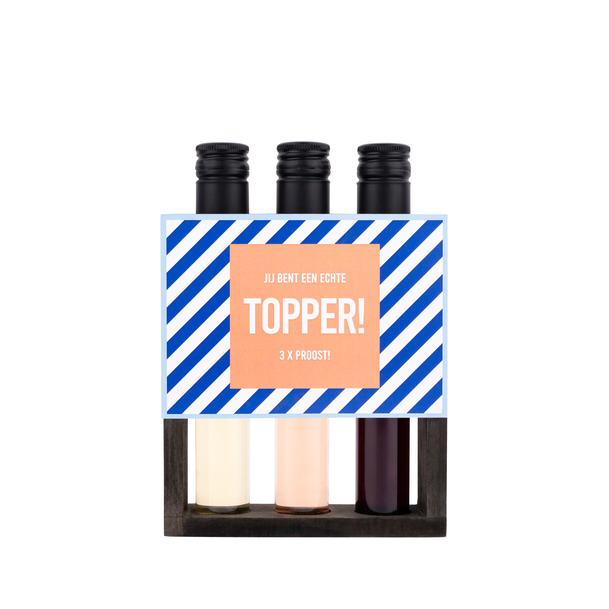 Een heerlijk wijnproeverijtje met de tekst TOPPER! Deze 3 tubes in houten rekje is het perfecte kado voor een echte wijnliefhebber. Rood, rosé en wit!