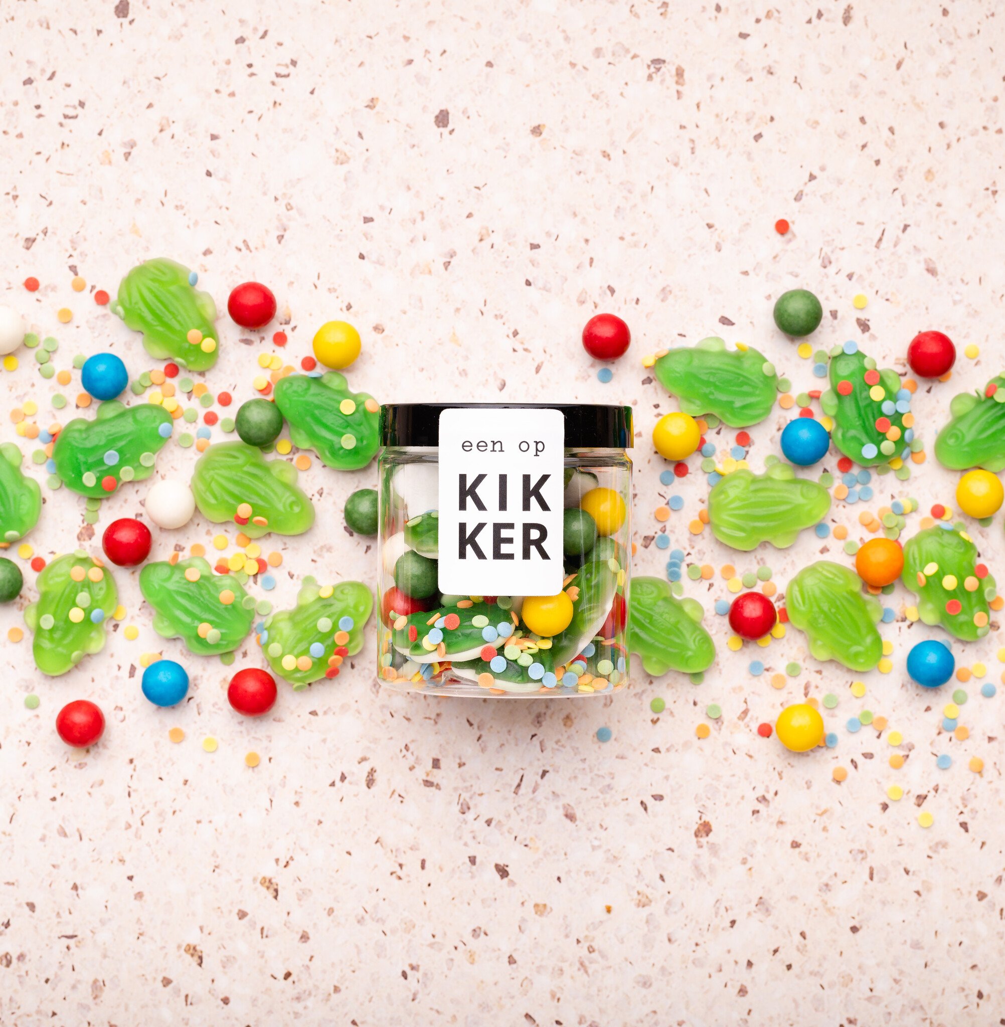 Een heerlijk en kleurrijk potje snoep met kikkers, kauwgomballen en confetti snoep. Op het witte etiket staat de tekst 'Een OPkikker'. Een leuk cadeautje om iemand op te vrolijken.
