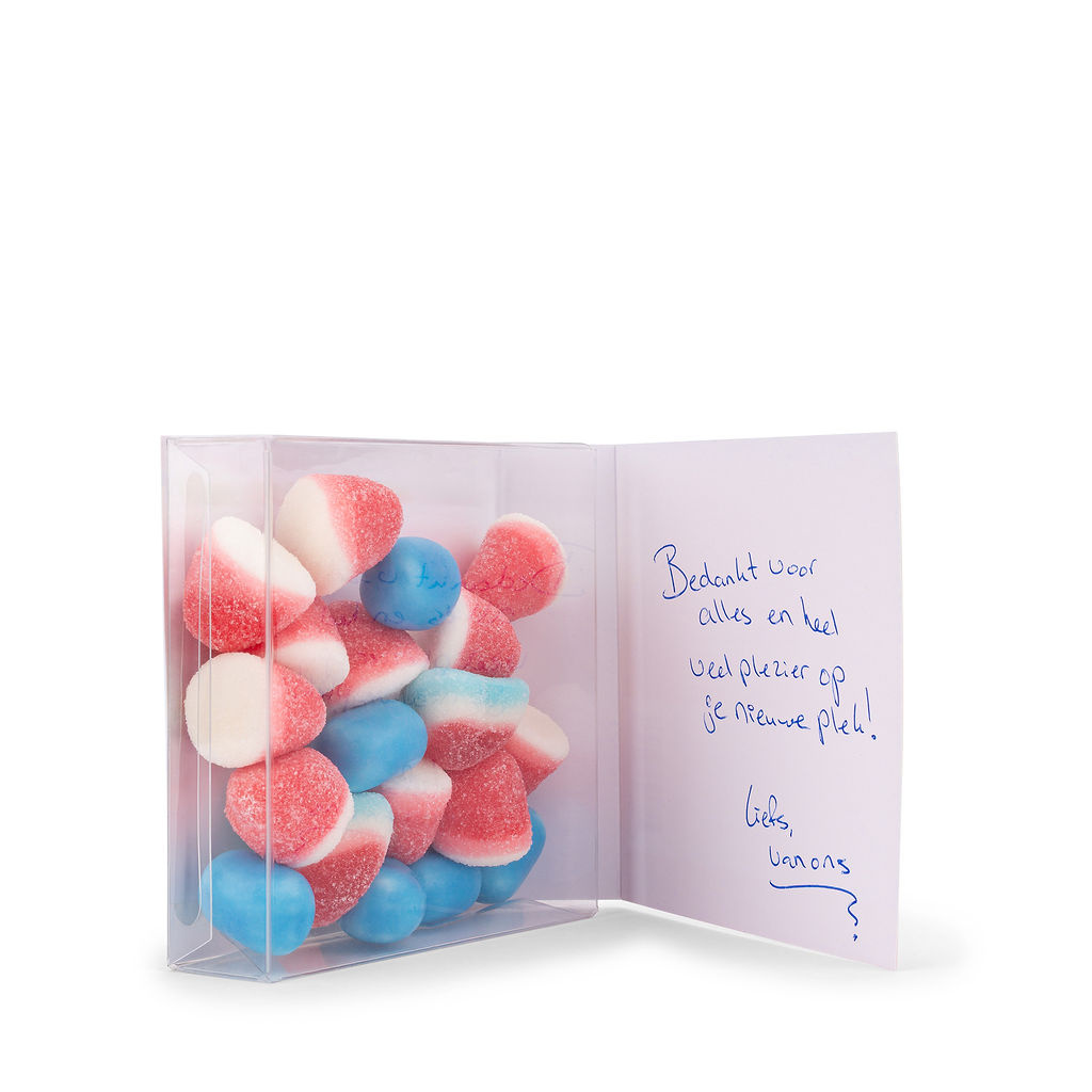 Een heerlijk en kleurrijke kaart met snoepmix rood, wit, blauw. Op de kaart staat de tekst 'Succes!' en in de binnenkant is er ruimte voor een persoonlijke boodschap. Een leuk klein cadeautje. Past in brievenbusdoos.