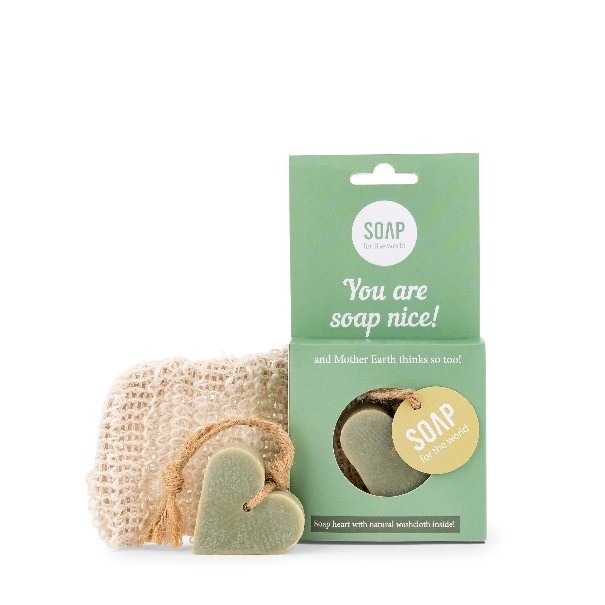Groen zeephart van natuurlijke zeep (5x5 cm) met zeepzakje, die ook als washandje gebruikt kan worden. Op de groene geschenkbox staat een leuke tekst 'You are soap nice!'.
