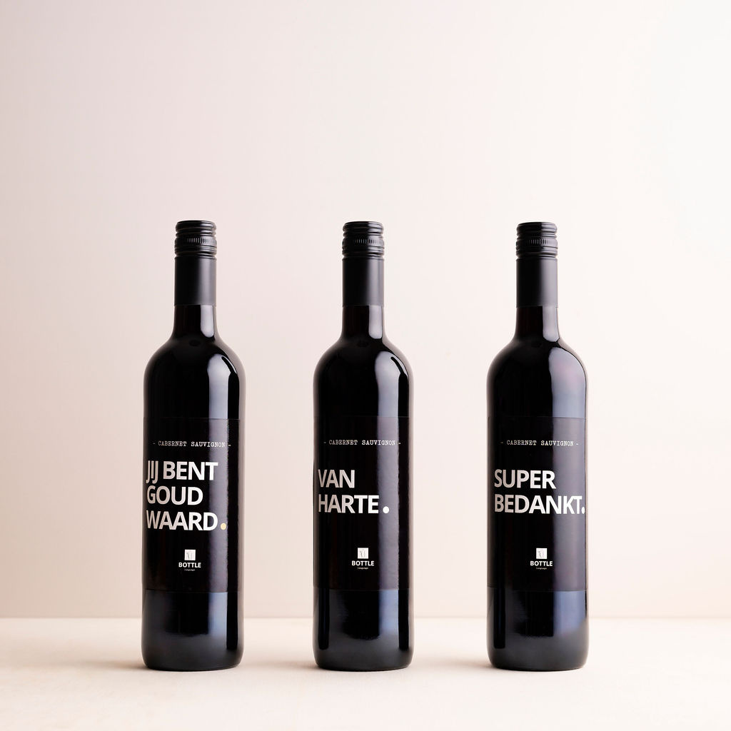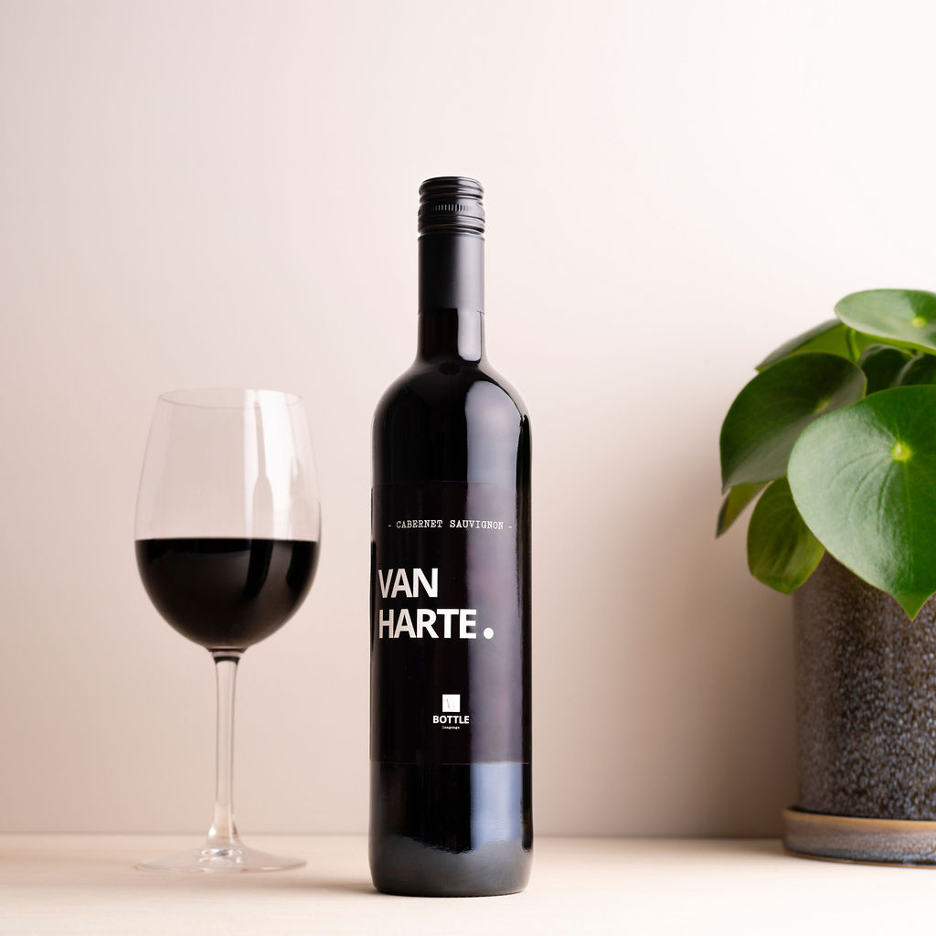 Een super leuke fles rode wijn met zwart etiket en tekst 'Van Harte'. Deze fles Cabernet Sauvignon is stevig en vol karakter. Het perfecte kado om iemand te feliciteren.