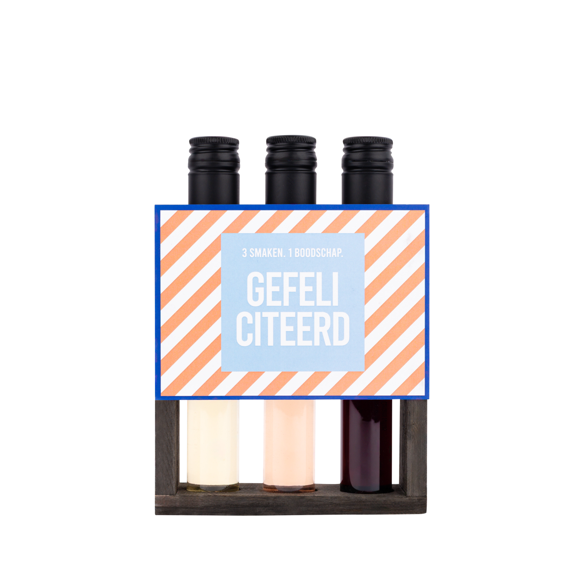 Een heerlijk wijnproeverijtje met de tekst GEFELICITEERD. Deze 3 tubes in houten rekje is het perfecte kado voor een echte wijnliefhebber.